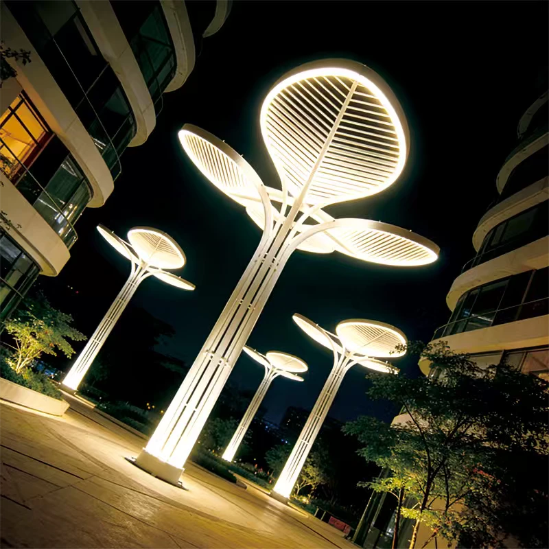 Unlike traditional garden lamps, the BioLeaf Sculpture Light features a large leaf-shaped canopy that mimics natural vein patterns. Its visually striking silhouette makes it an ideal garden sculpture light or centerpiece for commercial landscape sculpture light applications. The biomorphic form blends seamlessly into modern architectural environments, offering both functional lighting and visual storytelling.