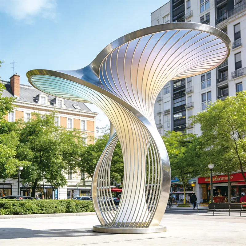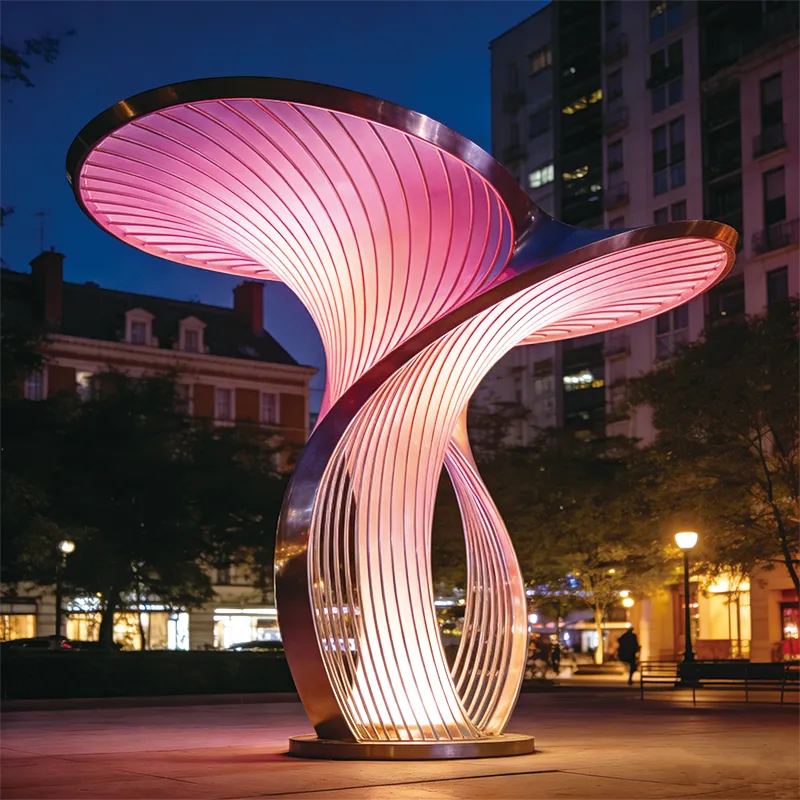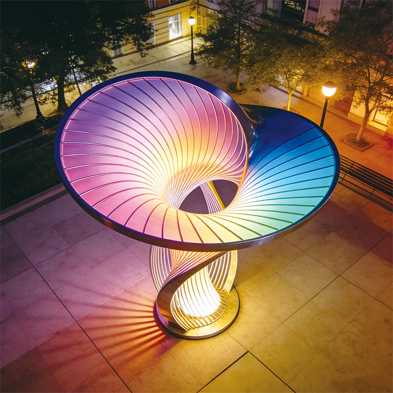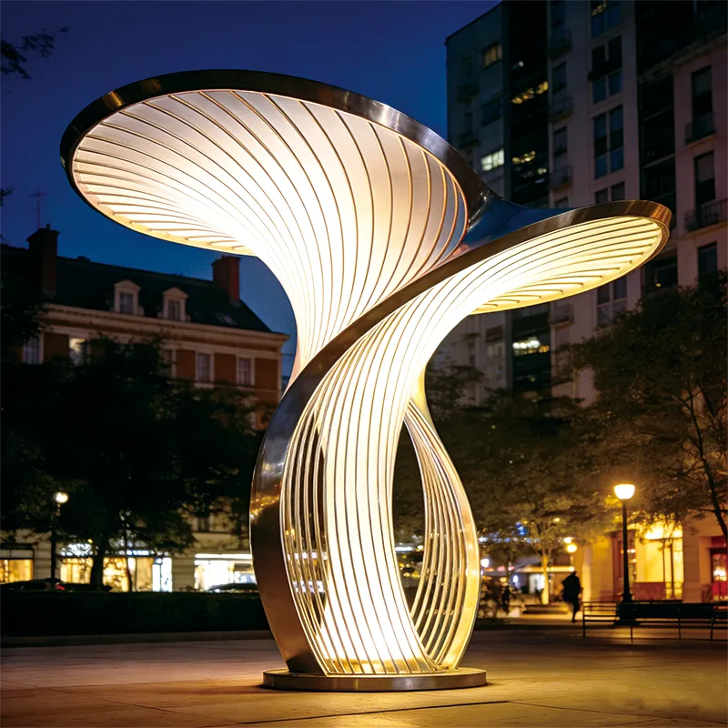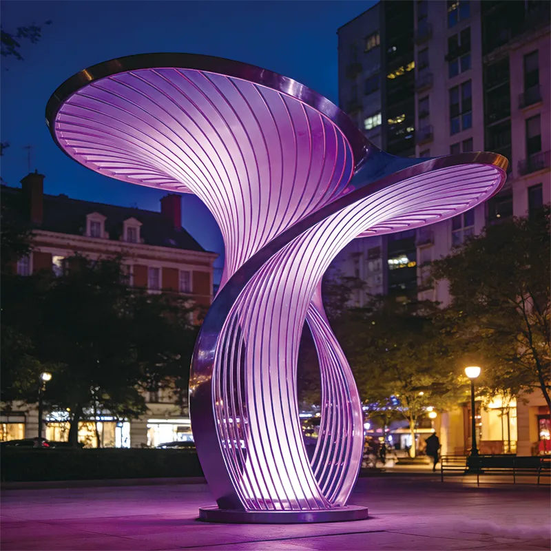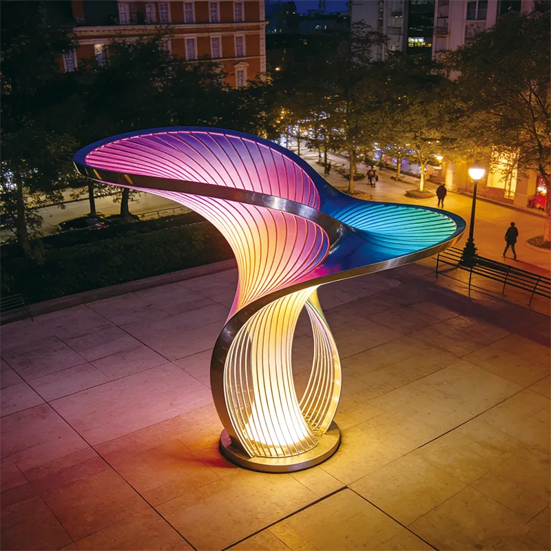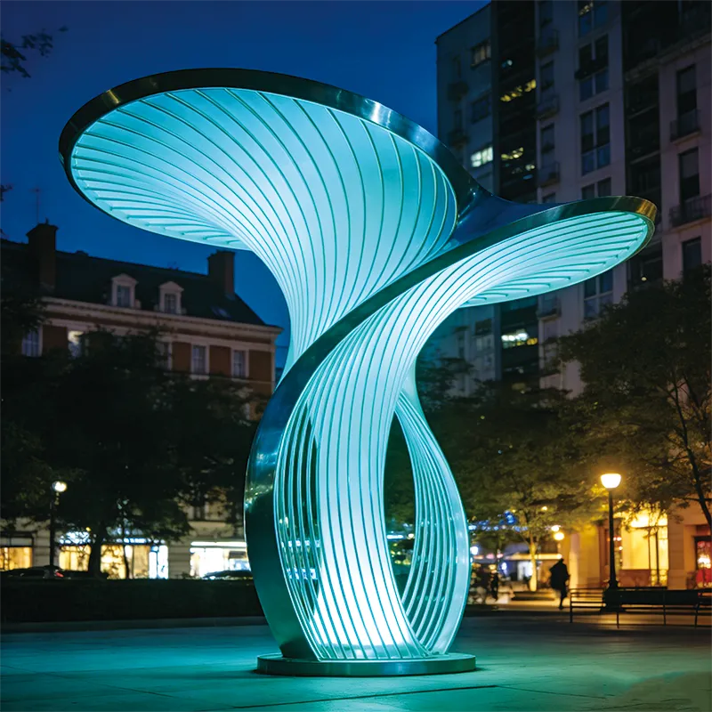 The “Urban Light” features a unique twisted hyperbolic silhouette. Rising from a solid base, its lines intertwine and expand upward, resembling soaring wings or flickering flames. During the day, it stands as a high-end metal sculpture; at night, it transforms into a breathtaking lighthouse of flowing colors.